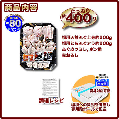 商品番号 mfg_chiri23 商品名 天然ふぐ鍋セット2-3人前/超冷 内容量 鍋用天然フグ上身 約200g、鍋用とらふぐアラ 約200g、ツミレ 4個、ポン酢、薬味 【天然フグについて】山口県産白サバフグ、島根県産マフグ、新潟県産ゴマフグを漁獲期に応じて使用しています。