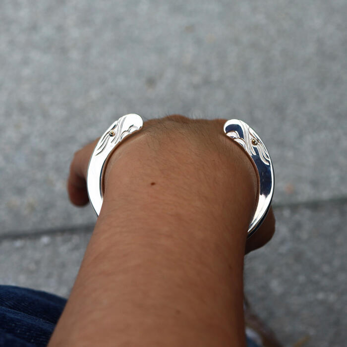 サイズに関して】 [MATERIAL] SV925 K18 [SIZE] Sサイズ(内径/13cm 最薄厚/5mm 最大幅/10mm) Mサイズ(内径/14cm 最薄厚/5mm 最大幅/10mm) Lサイズ(内径/14.5cm 最薄厚/5mm 最大幅/10mm) [購入の際の注意事項] 一点一点手作りしておりますので個体差が生じる場合も御座います。