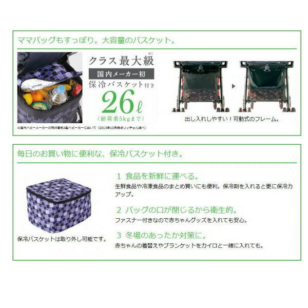 対象月齢/1カ月頃?36カ月頃 体重目安/15kgまで サイズ/ 47.5×77×104H(cm) 折りたたみ時:48×34×100H(cm) 製品重量/5.8kg(保冷バスケット込み6.1kg) 材質/アルミ、スチール、ポリエステル、ポリプロピレン、その他 リクライニング角度/110°?150° 座面幅/33(cm) 座面高さ/50(cm) バスケット容量/26L(耐荷重/5kg)●お支払い方法で代引きはできません。